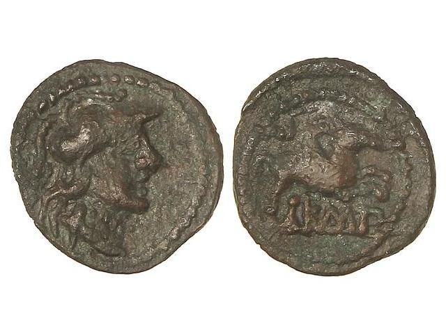 Cuadrante. EMPORITON-EMPORIA. Anv.: Cabeza de Palas a derecha. Rev.: Pegaso a derecha, encima láurea, debajo EMP. 1,38 grs. Pátina verde rojiza. (Ligeras oxidaciones). AB-1272. MBC+/MBC.