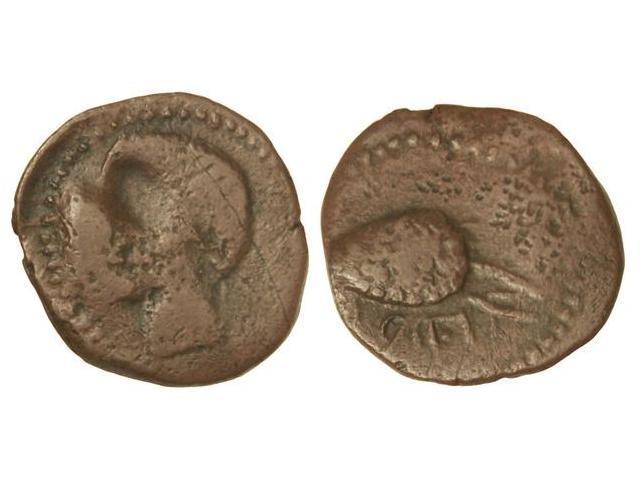 Cuadrante. - INCIERTA CON LEYENDA FENICIA. - Anv.: Cabeza masculina a izquierda. Rev.: Piña a izquierda, debajo leyenda fenicia y PB. 3,30 grs. MUY RARA. Vill-6, mismo ejemplar. BC+/MBC-. - -