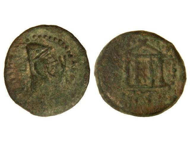 Cuadrante. MALACA. Anv.: Cabeza de Vulcano a derecha con gorro puntiagudo con puntos, delante tenazas, detrás leyenda neopúnica. Rev.: Templo tetrástilo con punto en el frontón y puerta en el centro. En exergo: SMS. 3,90 grs. Pátina verde. V