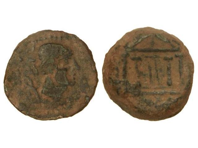 Cuadrante. MALACA. Anv.: Cabeza de Vulcano a derecha con gorro redondeado, detrás tenazas y leyenda neopúnica. Rev.: Templo tetrástilo con estrella de cuatro puntas en frontón y puerta en el centro. En exergo: SMS. 4,20 grs. Pátina verde. AB-1740 sim.; G.G.-66. MBC/MBC-.