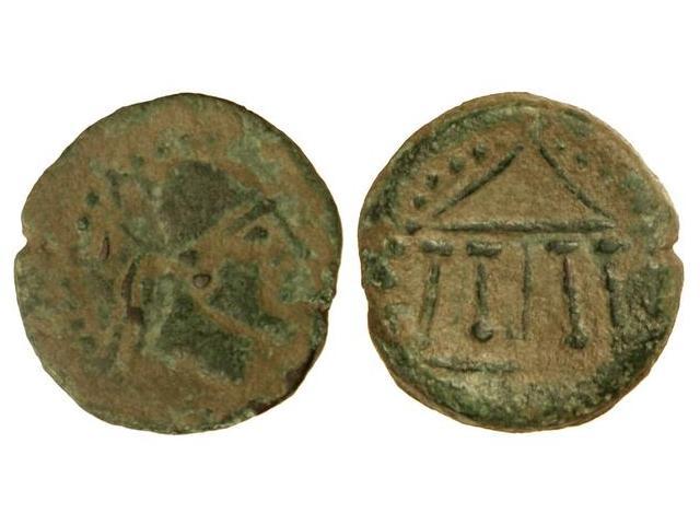 Cuadrante. MALACA. Anv.: Cabeza de Vulcano a derecha con gorro redondeado, detrás tenazas y leyenda neopúnica. Rev.: Templo tetrástilo con punto en el centro del frontón, puerta en el centro y verjas a los lados. 3,30 grs. Pátina verde. G.G.69; Vill-16 var. MBC-/MBC.
