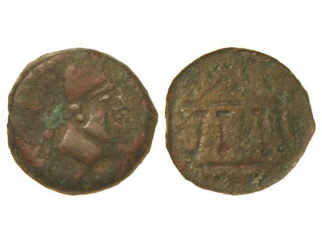 Cuadrante. MALACA. Anv.: Cabeza de Vulcano a derecha con gorro redondeado, detrás (tenazas y leyenda neopúnica). Rev.: Templo tetrástilo con punto en el centro del frontón, puerta en el centro y verjas a los lados. 4,20 grs. Pátina marrón. G.G.-69; Vill-16 var. MBC-.