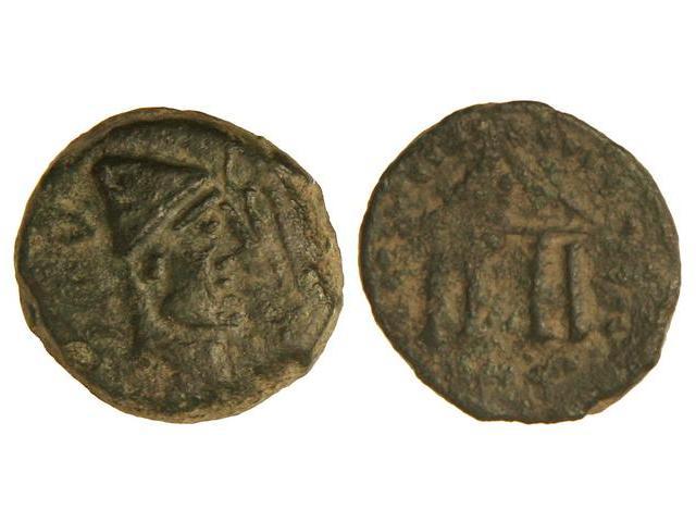 Cuadrante. MALACA. Anv.: Cabeza de Vulcano con gorro puntiagudo a derecha, delante tenazas, detrás leyenda neopúnica. Rev.: Templo tetrástilo con adornos en el frontón y puerta en el centro. 4,40 grs. (Pequeñas oxidaciones en reverso). Pátin