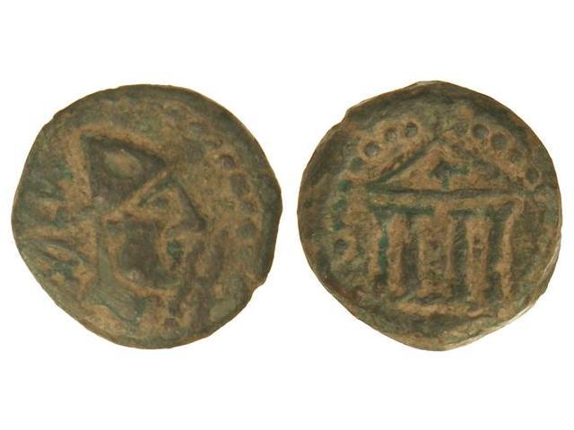 Cuadrante. MALACA. Anv.: Cabeza de Vulcano con gorro puntiagudo a derecha, delante tenazas, detrás leyenda neopúnica. Rev.: Templo tetrástilo con adornos en el frontón y puerta en el centro. 4,20 grs. Pátina verde. AB-1737 var.; G.G.-73. MBC+.