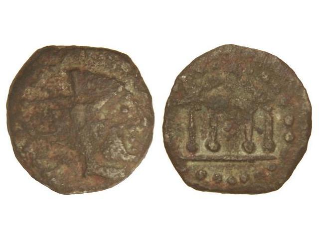 Cuadrante. MALACA. Anv.: Cabeza de Vulcano con gorro puntiagudo a derecha, delante (tenazas), detrás leyenda neopúnica. Rev.: Templo tetrástilo con adornos en el frontón y puerta en el centro. 2,90 grs. Pátina marrón. (Descentrada en anverso). AB-1737 var.; G.G.-73. BC+/MBC-.