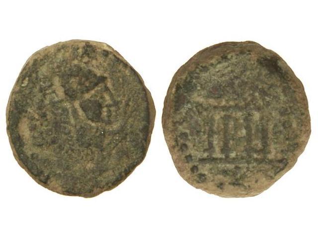 Cuadrante. MALACA. Anv.: Cabeza de Vulcano con gorro puntiagudo a derecha, delante tenazas y detrás leyenda neopúnica. Rev.: Templo tetrástilo con punto en el frontón y puerta en el centro. En exergo: SMS. 6,40 grs. Variante de anteriores por no llevar puntos en el gorro. Pátina verde. AB-1739 var.; G.G.-72. MBC-.