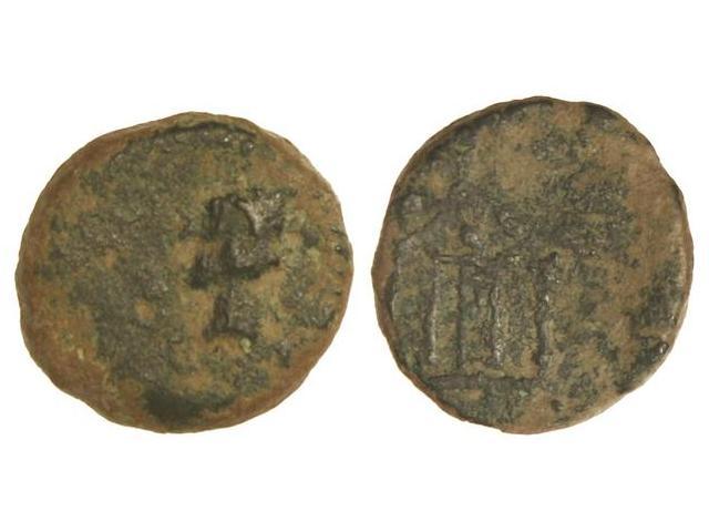Cuadrante. MALACA. Anv.: Cabeza de Vulcano con gorro puntiagudo a izquierda, delante (tenazas), detrás (leyenda). Rev.: Templo tetrástilo con punto en el frontón y puerta en el centro. 4,20 grs. Pátina negra. (Oxidaciones). AB-1742; G.G.-80 mismo ejemplar. MBC-.