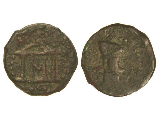 Cuadrante. MALACA. Anv.: Cabeza de Vulcano con gorro puntiagudo con puntos a derecha, delante tenazas, detrás leyenda neopúnica. Rev.: Templo tetrástilo con punto en el frontón y puerta en el centro. En exergo: SMS. 4,70 grs. Variante del G.G.-70 por cabeza y gorro más corto. Pátina oscura. (Oxidaciones). AB-1739 var.; G.G.-71. BC+/MBC-.