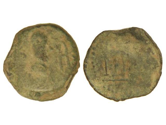 Cuadrante. MALACA. Anv.: Cabeza de Vulcano con gorro redondeado a derecha, delante tenazas, detrás (¿leyenda?). Rev.: Templo tetrástilo con punto en el frontón. 3,30 grs. Variante por cabeza más pequeña y gorro diferente. Pátina verde. ¿INÉD