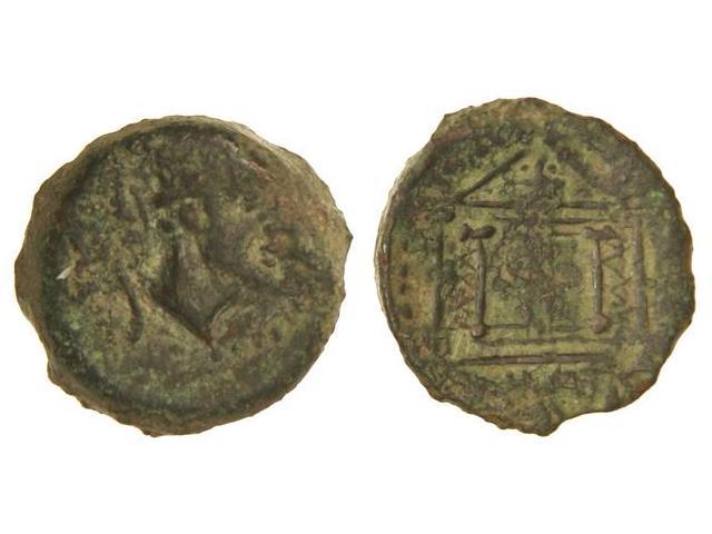 Cuadrante. MALACA. Anv.: Cabeza de Vulcano con gorro redondeado a derecha, detrás tenazas y leyenda neopúnica. Rev.: Templo tetrástilo con estrella de cuatro puntas en frontón y puerta en el centro. En exergo: SMS. 4,40 grs. Pátina verde. AB-1740 sim.; G.G.-66. MBC-/MBC.