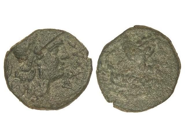 Cuadrante. UNTIKESKEN. Anv.: Cabeza de Palas a derecha, delante leyenda ibérica ATABELS. Rev.: León corriendo a derecha, encima leyenda ibérica (TIBERI), debajo UNTIKESKEN. 4,41 grs. Pátina verde. (Pequeñas oxidaciones limpiadas). MUY ESCASA. Vill-47. (MBC+).