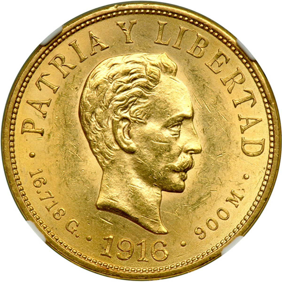 Cuba. 10 Pesos, 1916. Fr-3; KM-20. Weight 0.4837 ounce. Head of Marti. Reverse: Arms. NGC graded About Uncirculated, Details (Surface Hairlines).