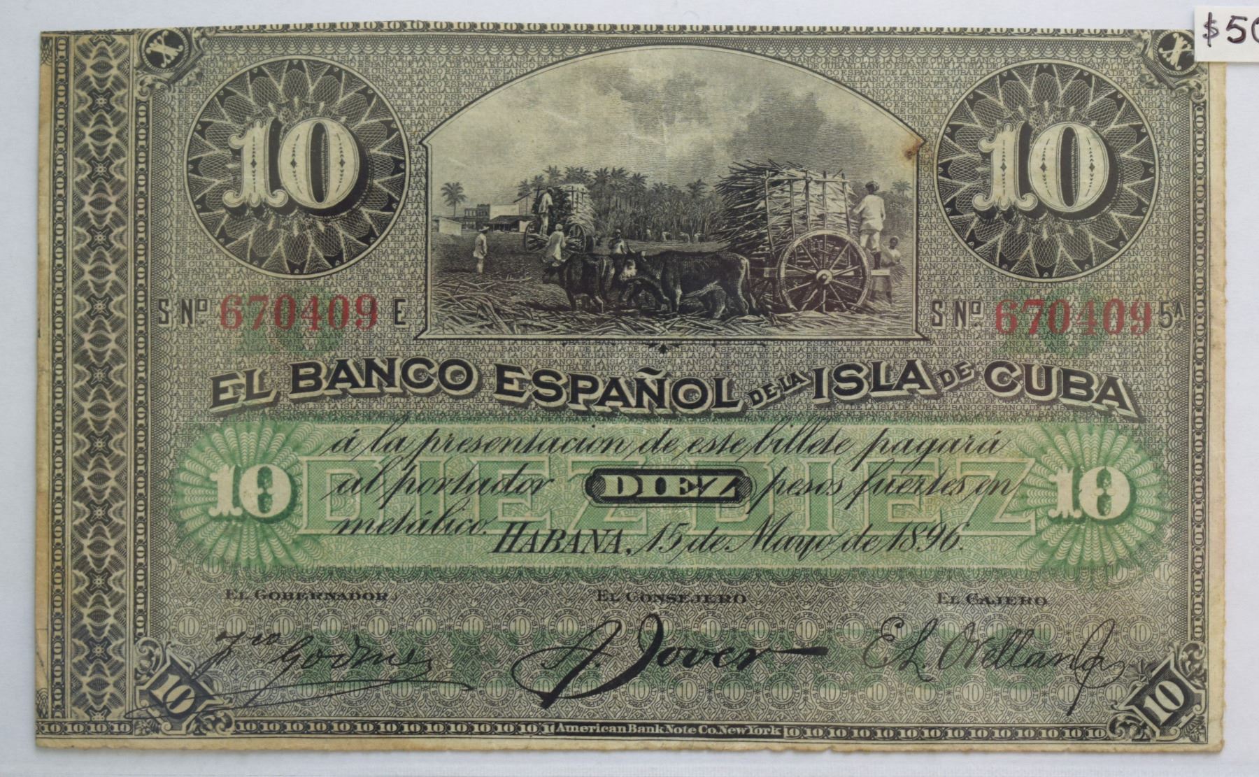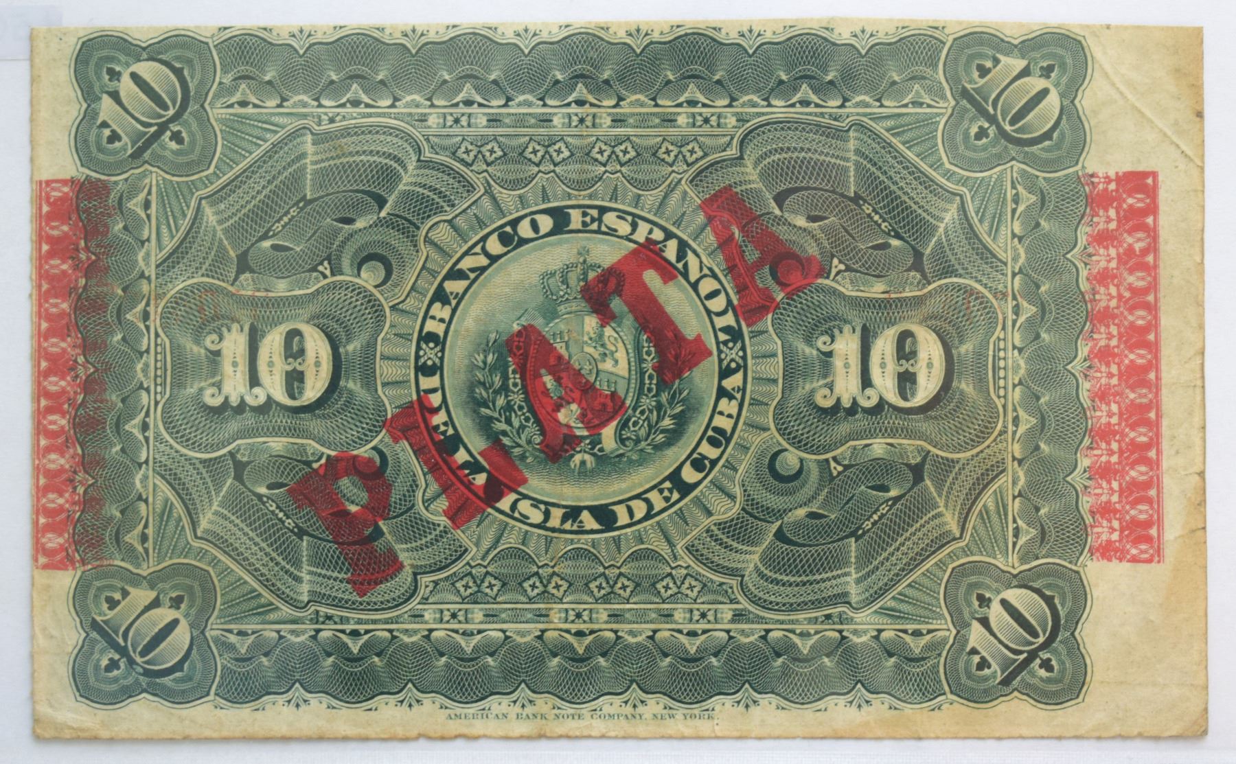 Cuba, 10 Pesos Fuertes (Issued Note Red overprint PLATA) 1896 ABNC Pick #49