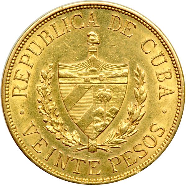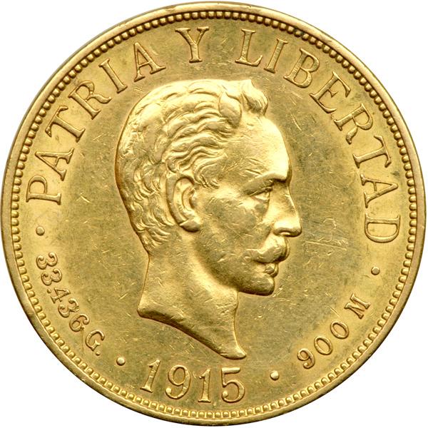 Cuba. 20 Pesos, 1915. Fr-1; KM-21. Weight 0.9675 ounce. Head of Marti right. Reverse: Arms. Minor handling marks. Very Fine.