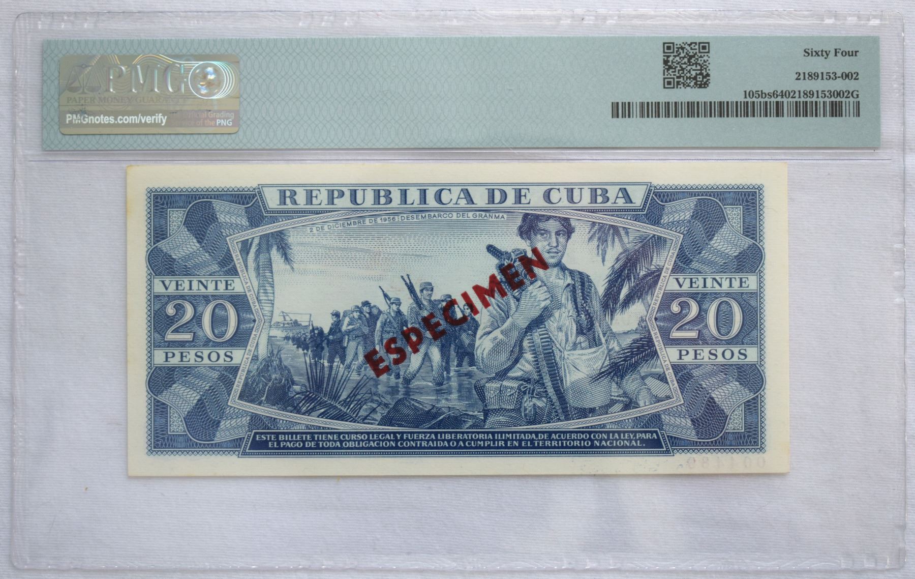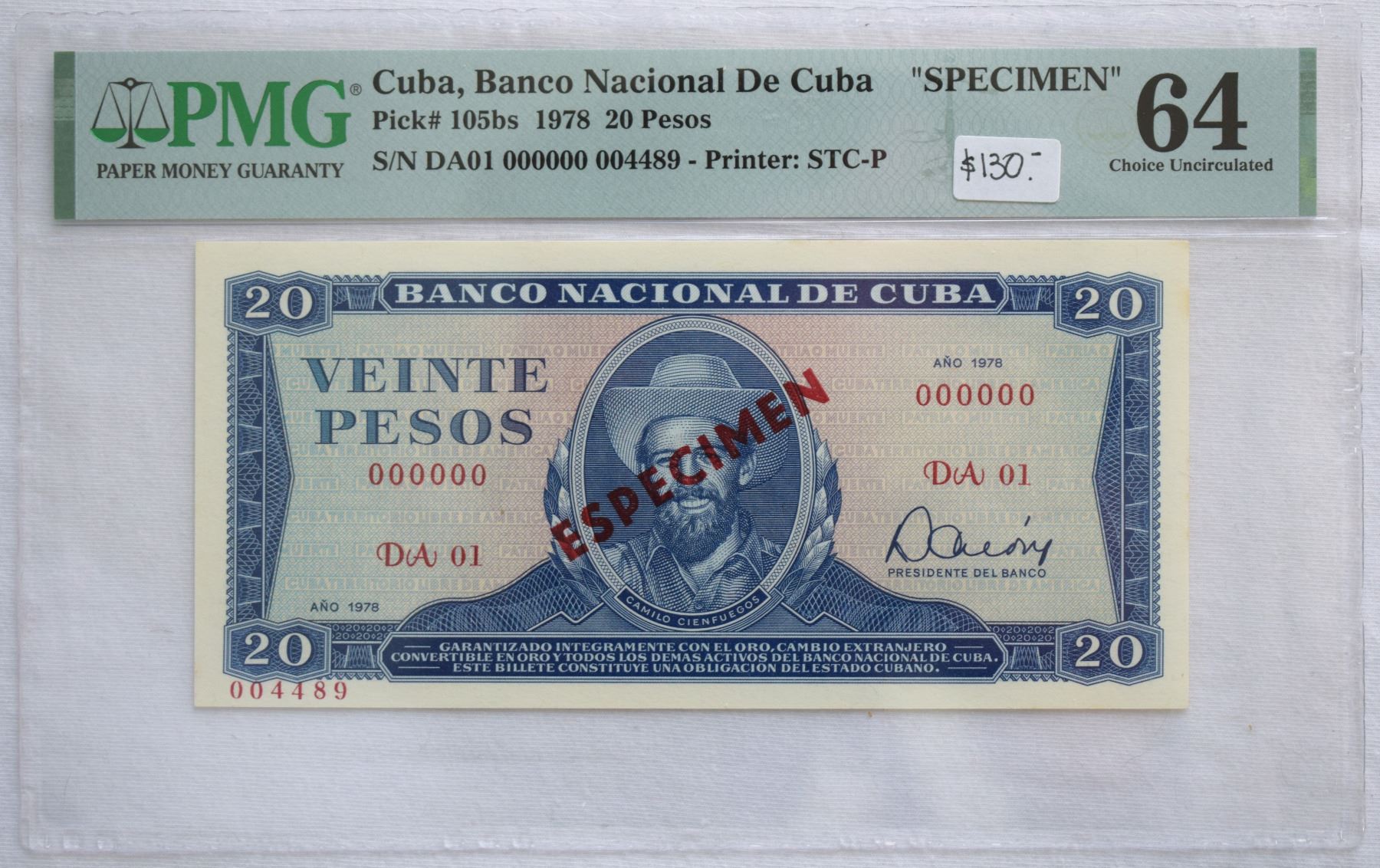 Cuba, 20 pesos 1978 "SPECIMEN" Note Pick# 105bS Choice UNC-64 PMG Certified