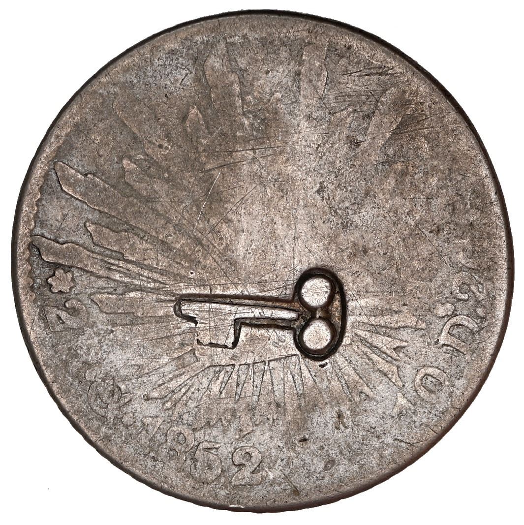 Cuba, 25 centavos, long-and-thin key incuse countermark (1872-77) on a Guanajuato, Mexico, cap-and-rays 2 reales, 1852 PF, PCGS AG3. KM-R1. The countermark very bold and full with dark toning inside, punched just below center of cap-and-rays side of a well-worn host with even, medium toning, the date and mintmark barely visible. Please use this link to verify the certification number