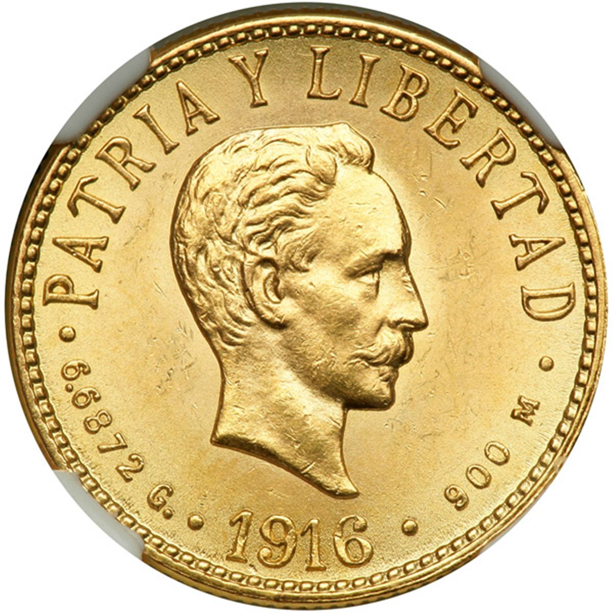 Cuba. 4 Pesos, 1916. Fr-5; KM-18. Head of Marti. Reverse: Arms. NGC graded MS-63.