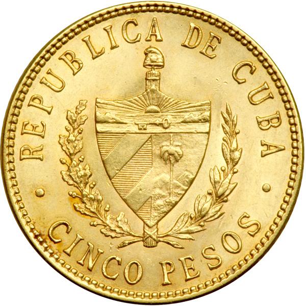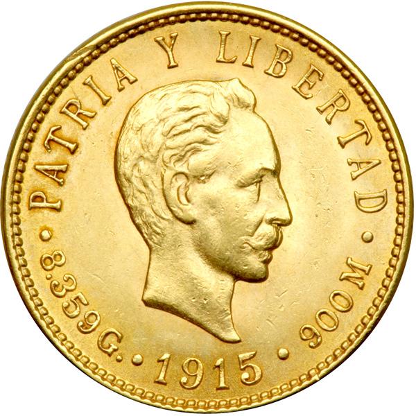 Cuba. 5 Pesos, 1915. Fr-4; KM-19. Weight 0.2419 ounce. Head of Marti right. Reverse: Arms. About Uncirculated.