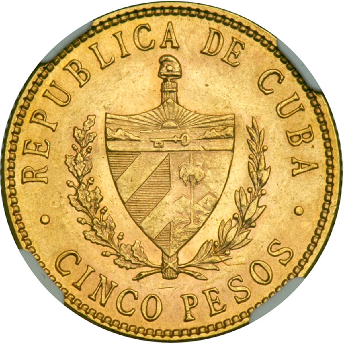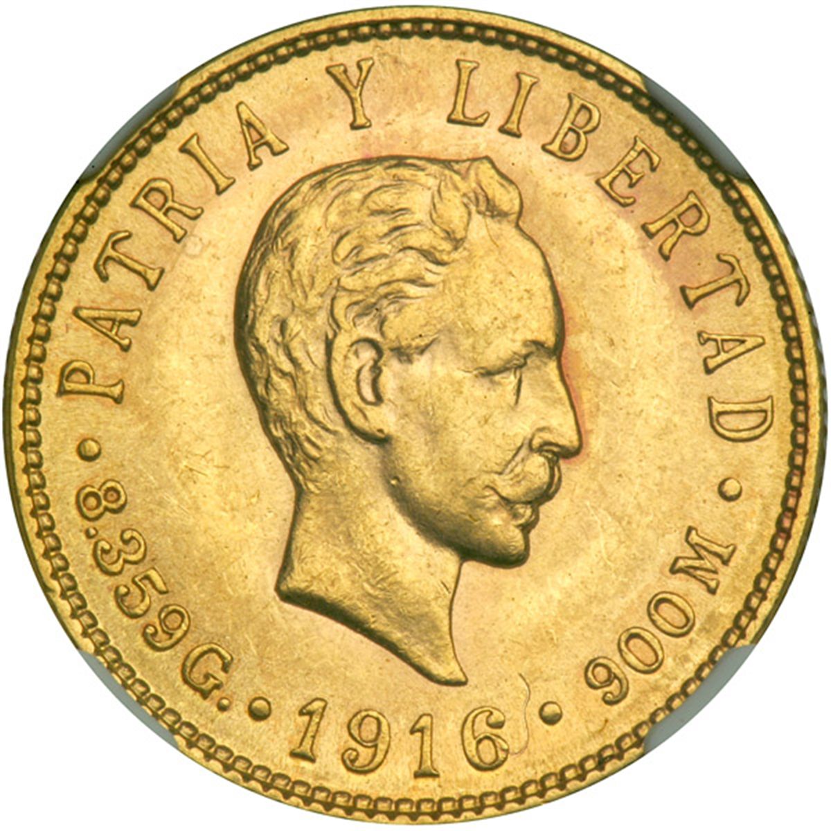 Cuba. 5 Pesos, 1916. Fr-4; KM-19. Weight 0.2419 ounce. Head of Marti. Reverse: Arms. NGC graded MS-62.