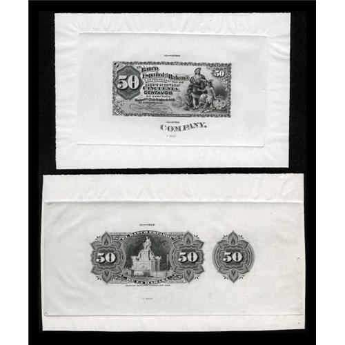 <B>Cuba</B></I> 50 Centavos 1889 Pick 33p Face and Back Proofs<BR> These proofs are printed on bond paper with overall measurements of approximately 7 by 4.5 inches for the face and 8.75 by 4.5 inches for the back. The Krause reference does not list any proofs for this design. <B>Choice Crisp Uncirculated.</B></I><BR><BR><b>Shipping:</b> Coins & Currency (<a target="_blank" href="http://www.heritageauctions.com/common/shipping.php">view shipping information</a>)