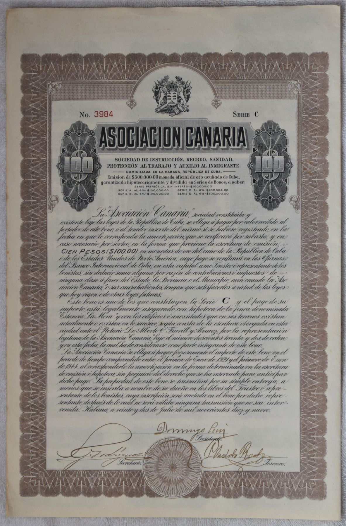 Cuba Action / Share Bond #3984 "Asociacion Canaria" 100 Pesos 1919 Extra Large size (38.5cm x 49,8cm) AUNC w/ all the Coupons as Issued, Not Often Offered