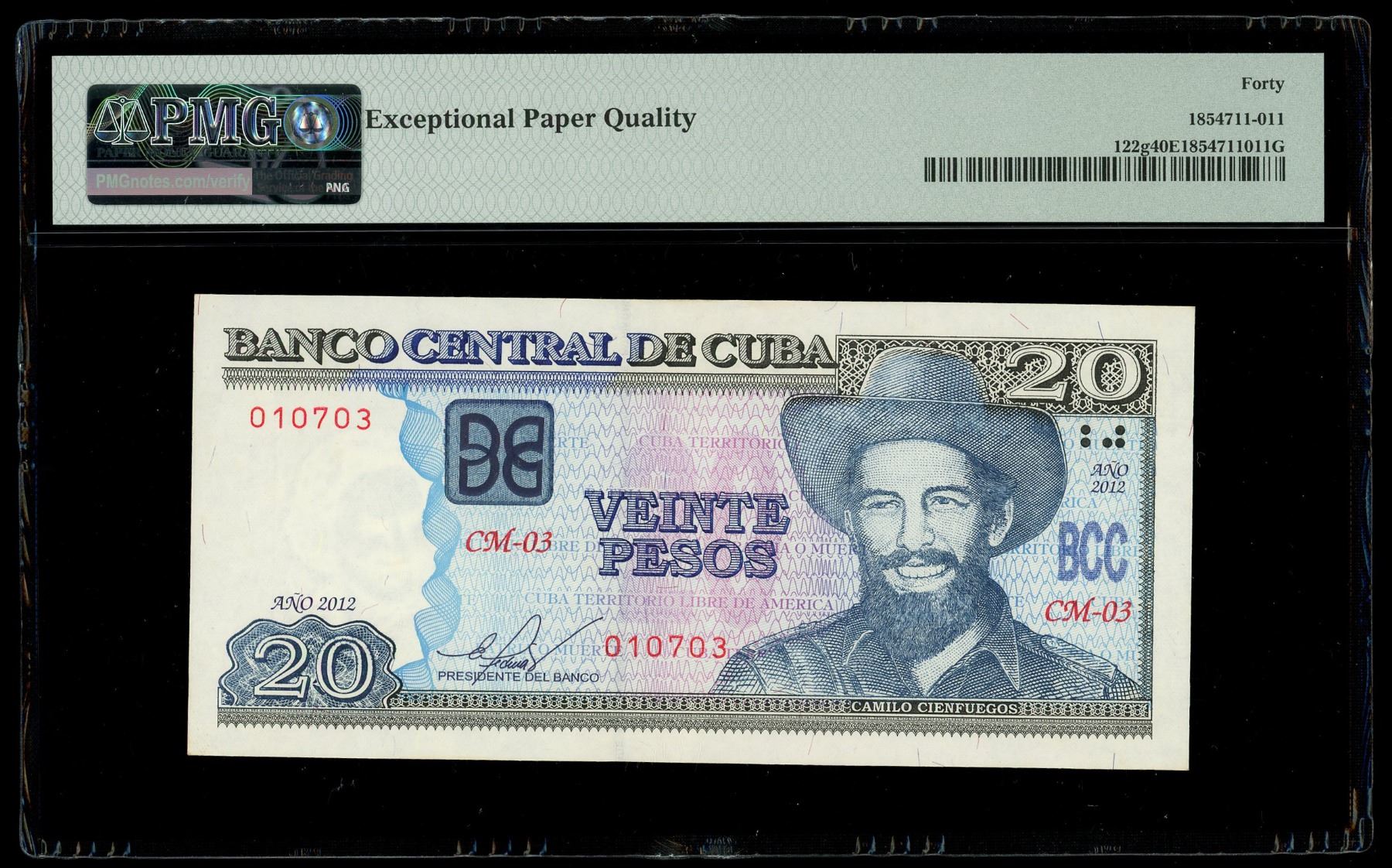 Cuba, Banco Central, 20 pesos, 2012, series CM-03, serial 010703, misalignment error, PMG XF 40 EPQ. SCWPM-122g. The back of this note was printed out of alignment to the left with a sliver of design missing. Modestly circulated yet retaining strong paper originality. Please use this link to verify the certification number