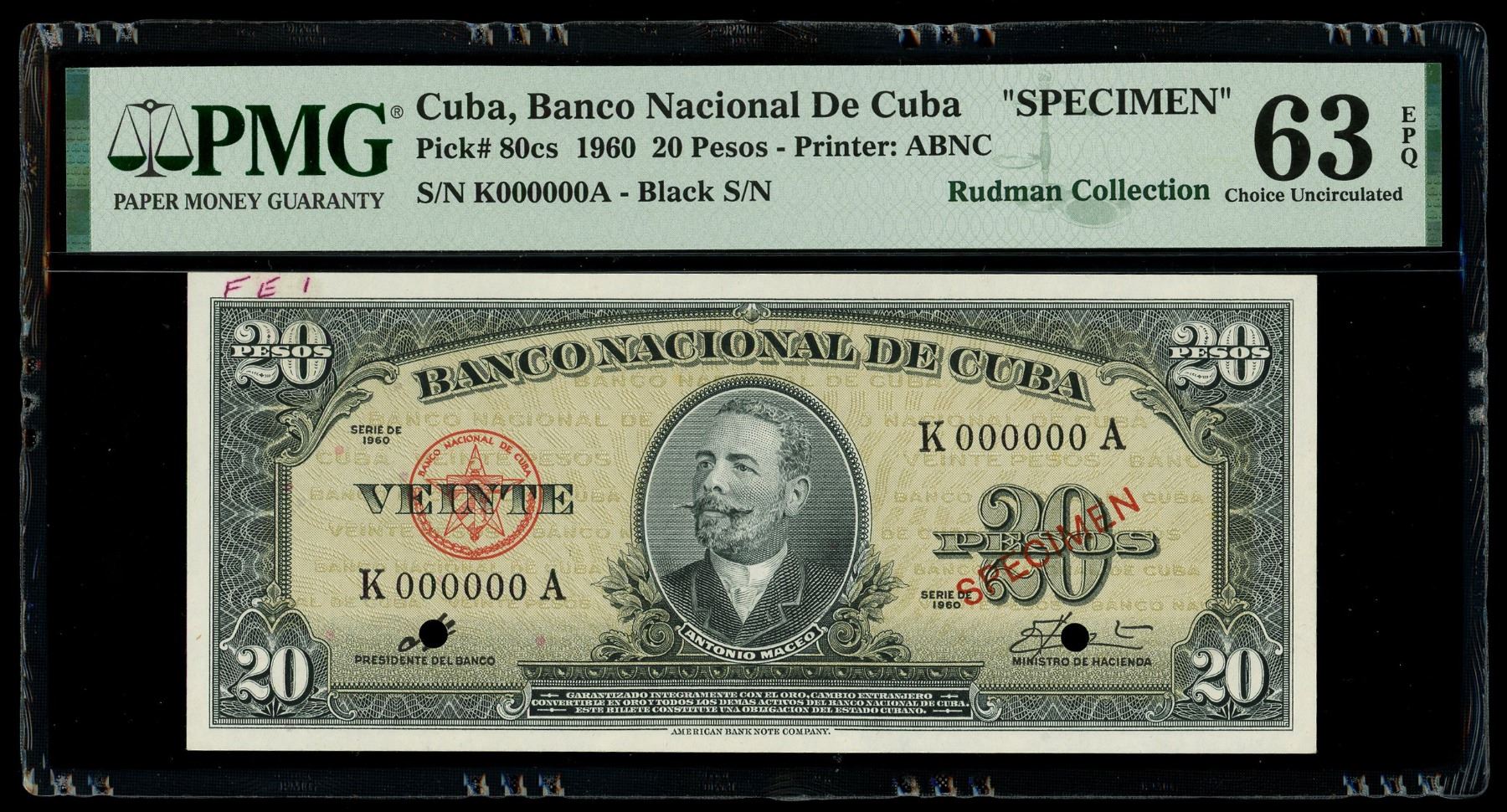 Cuba, Banco Nacional, 20 pesos specimen, series of 1960, with red specimen overprint, PMG Choice UNC 63 EPQ, ex-Rudman. SCWPM-80cs. Choice with exceptionally strong embossing seen all over, nicely centered with penned annotation in upper left margin. 2 POCs. Pedigreed to the Isaac Rudman Collection (stated on label). Please use this link to verify the certification number