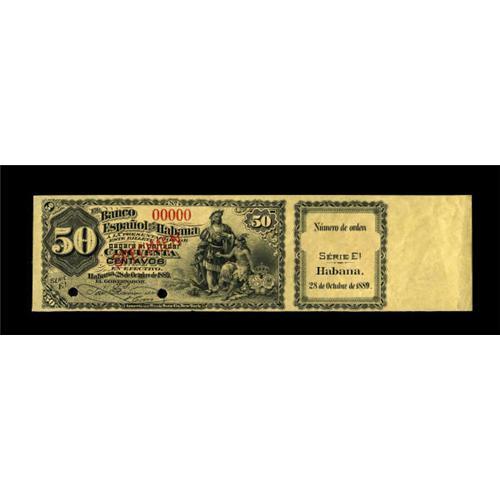 <B>Cuba</B></I> El Banco Espanol de la Habana 50 Centavos 1889 Pick 33a Specimen<BR> This lightly handled note still has the counterfoil attached and is punch cancelled. <B>About Uncirculated.</B></I><BR><BR><b>Shipping:</b> Coins & Currency (<a target="_blank" href="http://www.heritageauctions.com/common/shipping.php">view shipping information</a>)
