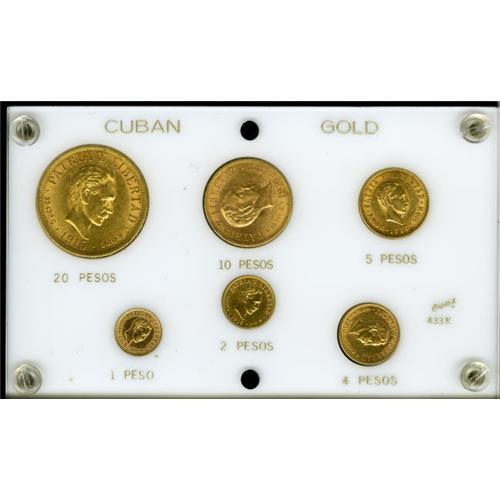 <B>First Republic, Six Piece Gold Type Set,</B></I> including 1 Peso 1915, KM16, cleaned XF, 2 Pesos 1916, KM17, cleaned XF with scratches, 4 Pesos 1916, KM18, lightly cleaned XF with light obverse scrapes, 1916 5 Pesos 1916, KM19, XF, 10 Pesos 1916, KM20, AU and 20 Pesos 1915, KM21, AU. The coins are housed in a Capital Plastics holder. <B>Sold as is, no return lot.</B></I><BR><I>From the Marrero Family Collection.</B></I><BR><BR><b>Shipping:</b> Coins & Currency (<a target="_blank" href="http://www.heritageauctions.com/common/shipping.php">view shipping information</a>)