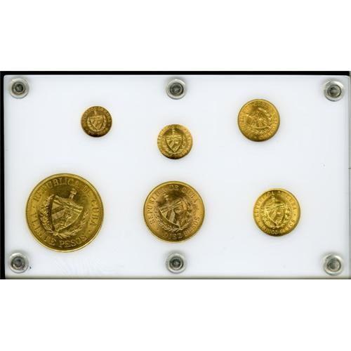 <B>First Republic, Six Piece Gold Type Set,</B></I> including 1 Peso 1916, KM16, cleaned XF-AU with mount mark on edge, 2 Pesos 1916, KM17, XF-AU, 4 Pesos 1916, KM18, AU with some spots, 5 Pesos 1916, KM19, AU with obverse scratch, 10 Pesos 1915, KM20, Choice AU, and 20 Pesos 1915, KM21, nice AU. The coins are housed in a Capital Plastics holder. <B>Sold as is, no return lot.</B></I><BR><I>From the Marrero Family Collection.</B></I><BR><BR><b>Shipping:</b> Coins & Currency (<a target="_blank" href="http://www.heritageauctions.com/common/shipping.php">view shipping information</a>)