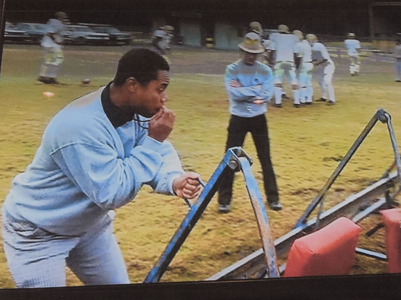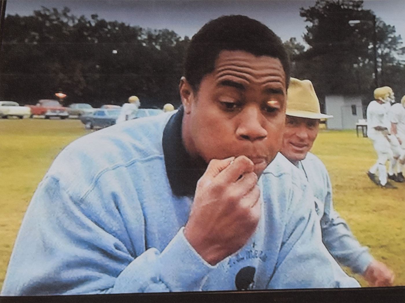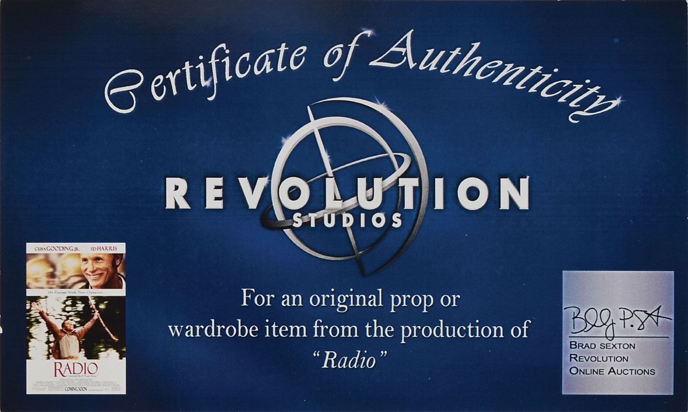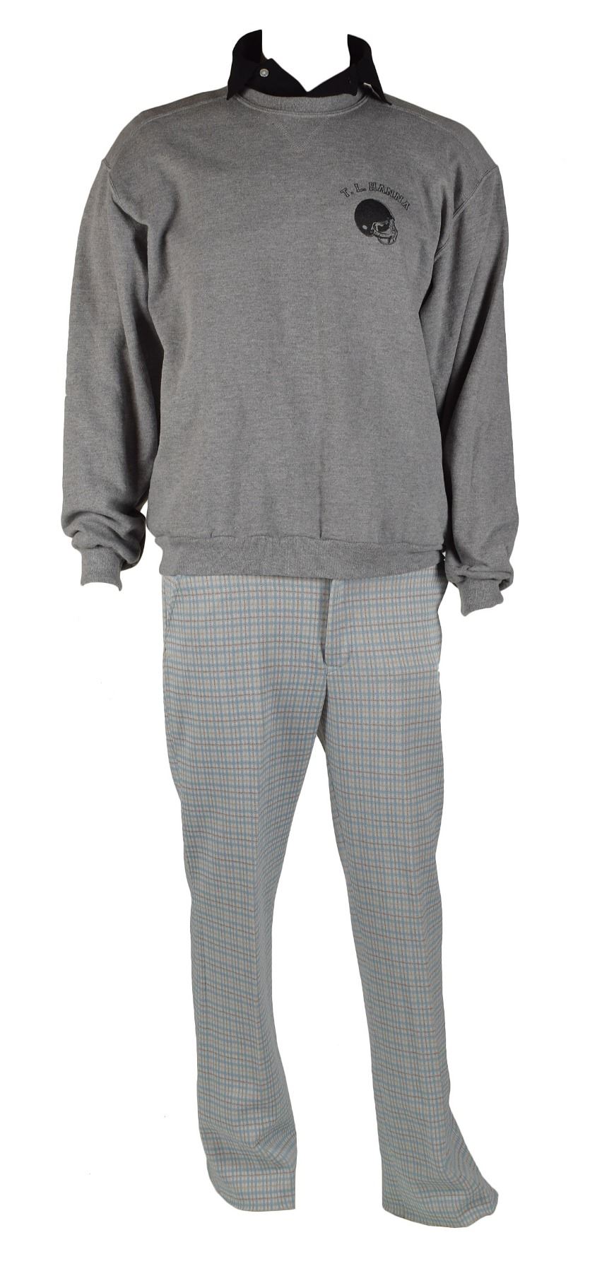 Outfit comprising a shirt, sweatshirt, and pants, worn on screen by Cuba Gooding, Jr., in his starring role as Radio in the moving 2003 drama Radio, seen during the scenes in which Radio is calling the drills on the 'sled' during football practice. The gray polyester/cotton sweatshirt, size large, was made by Jerzees and features a black football helmet and name of the high school, "T. L. Hanna," emblazoned on the chest. The black short-sleeve polo shirt has its tag cut out, and features the same logo in yellow. The plaid retro-style pants feature a blue, brown, and beige pattern, and are marked "Hero" in the waistband. In overall fine condition. Accompanied by a certificate of authenticity from Revolution Studios.