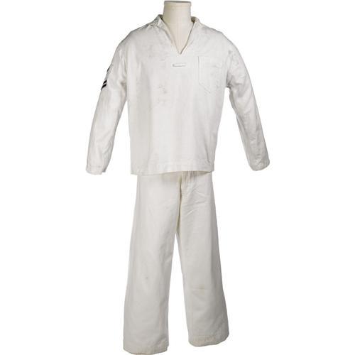 <B>Cuba Gooding Jr.'s Uniform from "Pearl Harbor."</B></I> White pants and white enlisted man's tunic with rank insignia on the right sleeve, worn by Gooding as Petty Officer Second Class Dorie Miller in Michael Bay's 2001 war movie. In Very Fine to Excellent condition with some mild to moderate staining, and with Gooding's name written on the inside of the collar.<BR><BR><b>Shipping:</b> Clothing & Costumes (<a target="_blank" href="http://www.heritageauctions.com/common/shipping.php">view shipping information</a>)