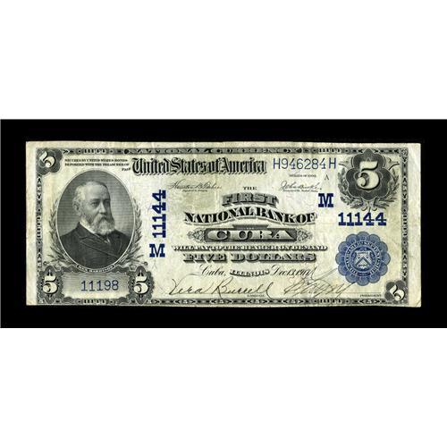 <B>Cuba, IL</B></I> - $5 1902 Plain Back Fr. 605 <B>The First NB</B></I> Ch. # (M)11144<BR>Nice penned signatures are highlights of this note. <B>Fine+.</B></I>$5<BR><BR><b>Shipping:</b> Coin/Currency (<a target="_blank" href="http://www.heritageauctions.com/common/shipping.php">view shipping information</a>)