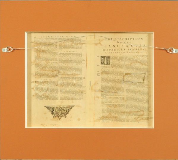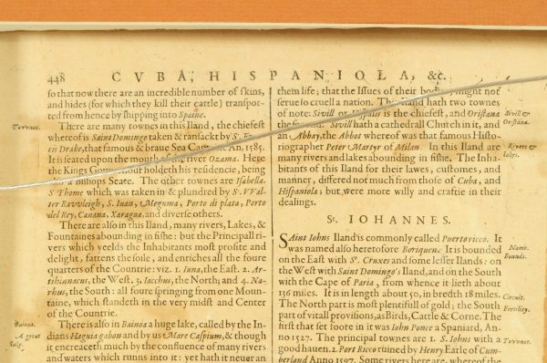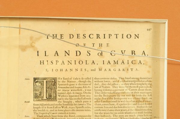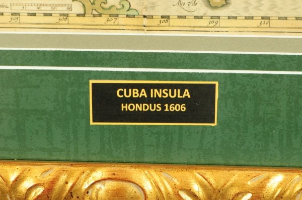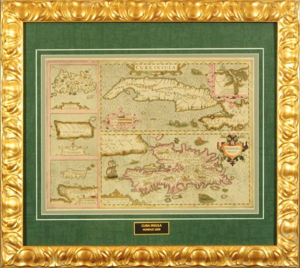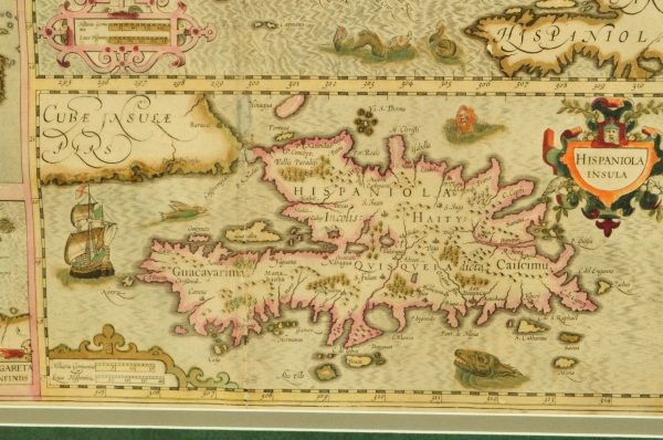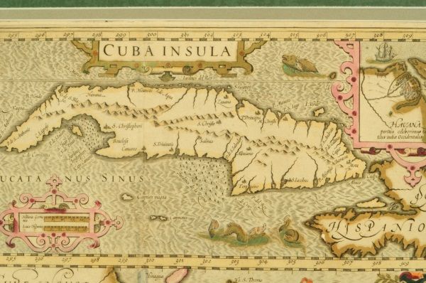 1606 is date of first edition. This map dates to 1613-1616. Excellent details of Cuba and adjoining Islands with details of Havana Harbor. Beautiful cartouches of sea monsters and ships, with decorative titles and picturesque antique coloring. Framing allows for two-sided viewing. Some restoration. Image measures 19-1/4" x 14".