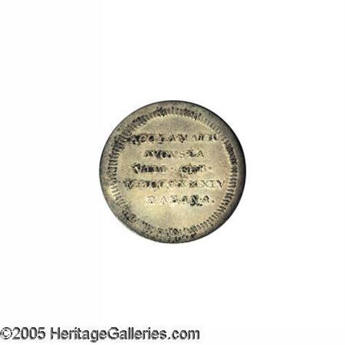 <B>Isabel II Silver Proclamation Medal 1834 Habana, </B></I>Medina 415, Herrera 45, toned AU with considerable underlying luster. Obverse: Civic arms of Habana and legends; Reverse: Legends including date and Habana. 31.5 mm, 9.52 grams. Very scarce type and grade.