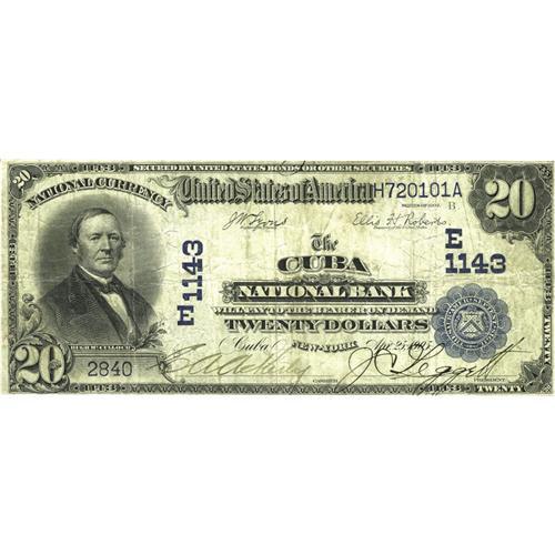 <B>Cuba, NY</B></I> - $20 1902 Date Back Fr. 642 <B>The Cuba NB</B></I> Ch. # (E)1143<BR>A new piece to the census from this avidly collected community. Pen signed <B>Fine,</B></I> with the margins trimmed a bit close.