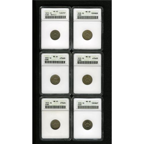 <B>Republic 1 Centavo group 1915:</B></I> KM-9.1, 2x MS61, 3x MS62, 1x MS63, all ANACS.<BR><BR><b>Shipping:</b> Coins & Currency (<a target="_blank" href="http://www.heritageauctions.com/common/shipping.php">view shipping information</a>)