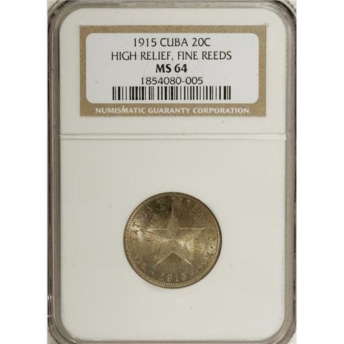 <B>Republic 20 Centavos 1915 High Relief, Fine Reeding, </B></I>KM13.1, MS64 NGC, a lovely coin with attractive patina over fully lustrous surfaces.<BR><BR><b>Shipping:</b> Coins & Currency (<a target="_blank" href="http://www.heritageauctions.com/common/shipping.php">view shipping information</a>)