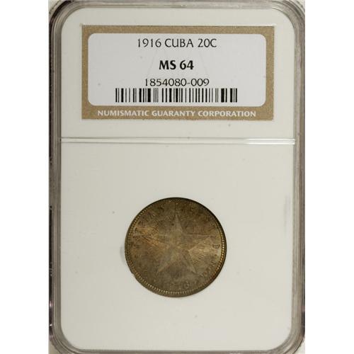 Cuba: Republic 20 Centavos 1916, KM13.2, MS64 NG