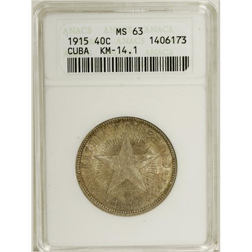 <B>Republic 40 Centavos 1915 High Relief Star, </B></I>KM14.1, MS63 ANACS, a deeply toned and highly attractive example, clearly a premium coin for this designation. You don't often encounter this denomination with such immediate eye appeal.<BR><BR><b>Shipping:</b> Coins & Currency (<a target="_blank" href="http://www.heritageauctions.com/common/shipping.php">view shipping information</a>)