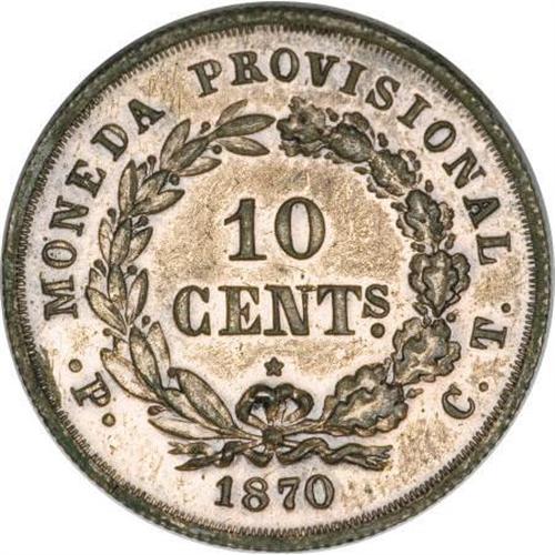 <B>Republic Copper Pattern 10 Centavos 1870,</B></I> KM-X2a, AU, harshly cleaned long ago and toning. What appear to be scratches on the obverse above the coat of arms are actually areas of irregular patina and not damage to the surface of the coin. Believed to have been struck in New York by Republican sympathizers following the revolt of 1868. Very rare.<BR><BR><b>Shipping:</b> Coins & Currency (<a target="_blank" href="http://www.heritageauctions.com/common/shipping.php">view shipping information</a>)