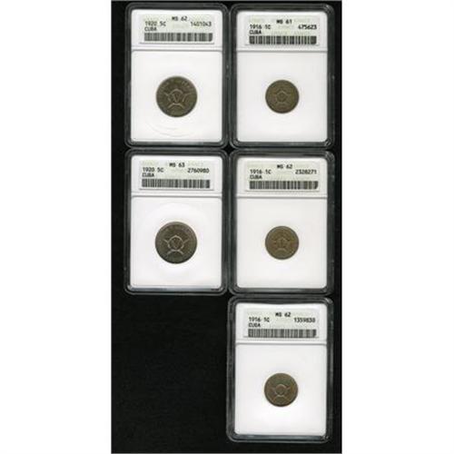 <B>Republic, another nice minors lot:</B></I> 1c 1916 KM-9.1 MS61 ANACS; two more, MS62 ANACS; 5c 1920 KM-11.1 MS62 ANACS; another MS63 ANACS.<BR><BR><b>Shipping:</b> Coins & Currency (<a target="_blank" href="http://www.heritageauctions.com/common/shipping.php">view shipping information</a>)