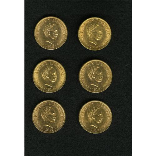 <B>Republic gold 10 Pesos 1916 - Six Examples, </B></I>KM20, all are lustrous XF-AU to AU, some with small contact marks. <B>Sold as is, no return lot.</B></I><BR><I>From the Marrero Family Collection.</B></I><BR><BR><b>Shipping:</b> Coins & Currency (<a target="_blank" href="http://www.heritageauctions.com/common/shipping.php">view shipping information</a>)