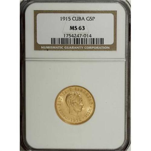 <B>Republic gold 5 Pesos 1915,</B></I> KM19, MS63 NGC, fully lustrous and attractive.<BR><BR><b>Shipping:</b> Coins & Currency (<a target="_blank" href="http://www.heritageauctions.com/common/shipping.php">view shipping information</a>)