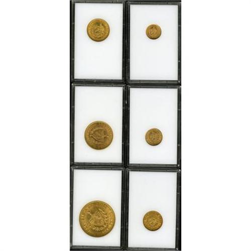 <B>Republic gold Denomination Set,</B></I> a complete set of the six types presented in individual custom plastic holders: Peso 1916 nice UNC, 2 Pesos 1916 toned AU, 4 Pesos 1916 toned XF-AU, 5 Pesos 1916 AU, 10 Pesos 1916 AU and 20 Pesos 1915 AU with some noticeable contact marks on the obverse. <B>Sold as is, no return lot.</B></I><BR><BR><b>Shipping:</b> Coins & Currency (<a target="_blank" href="http://www.heritageauctions.com/common/shipping.php">view shipping information</a>)