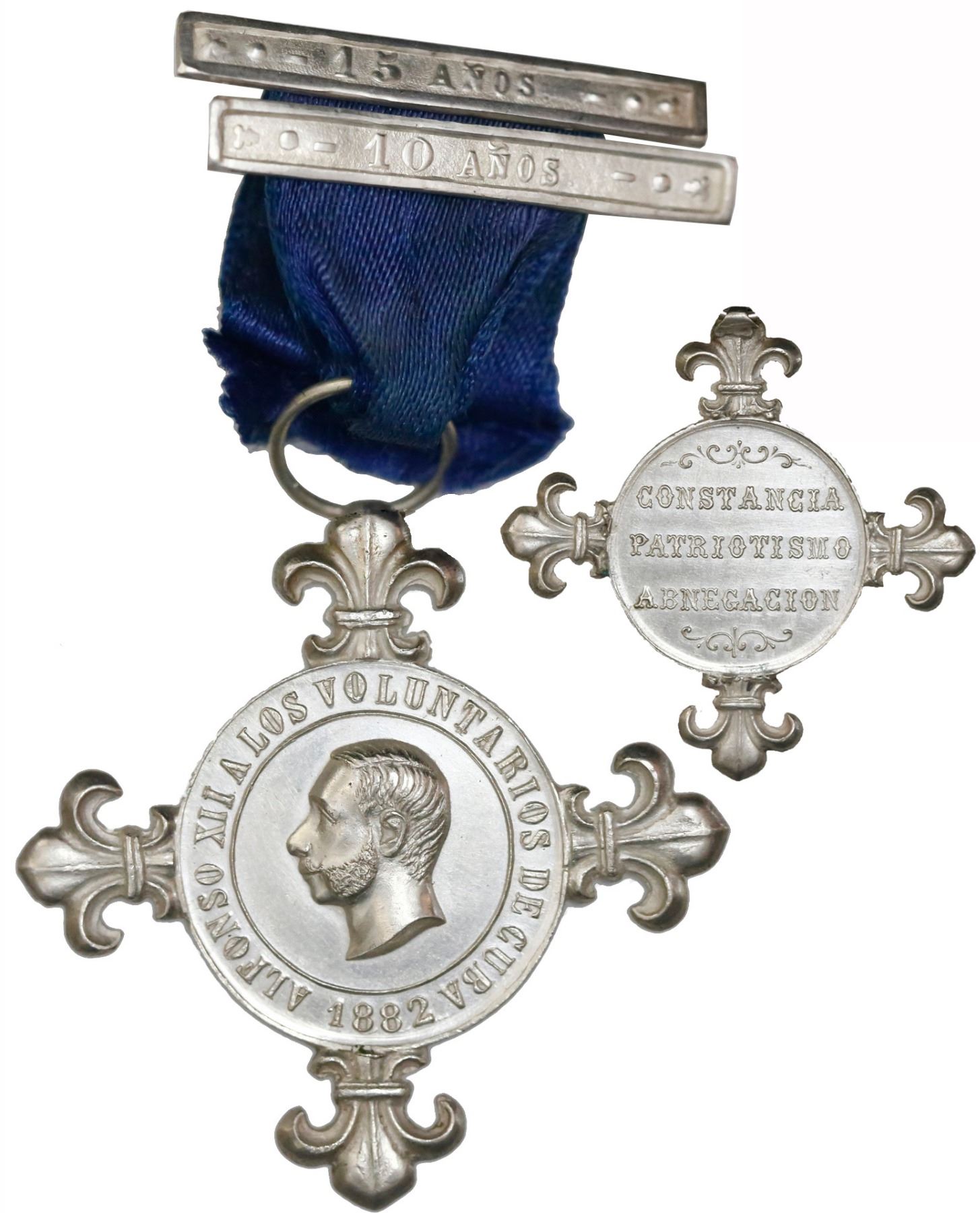Cuba, silver medal, 1882, Alfonso XII, Volunteers, with fleurs at four points and loop at top attached to blue ribbon with 10- and 15-year service bars. 15.51 grams. Blue ribbon, though contemporary, is probably not original. Cleaned UNC, fully untoned.