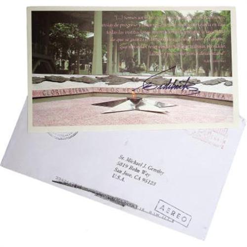 <B>Cuban President Fidel Castro Ruz Signature</B></I> on a 8.75” x 5” color card picturing La Llama Eterna, Museo de la Revolución. Included is the original envelope postmarked January 7, 2003.<BR><BR><BR><b>Shipping:</b> Flat Material, Small (<a target="_blank" href="http://www.heritageauctions.com/common/shipping.php">view shipping information</a>)