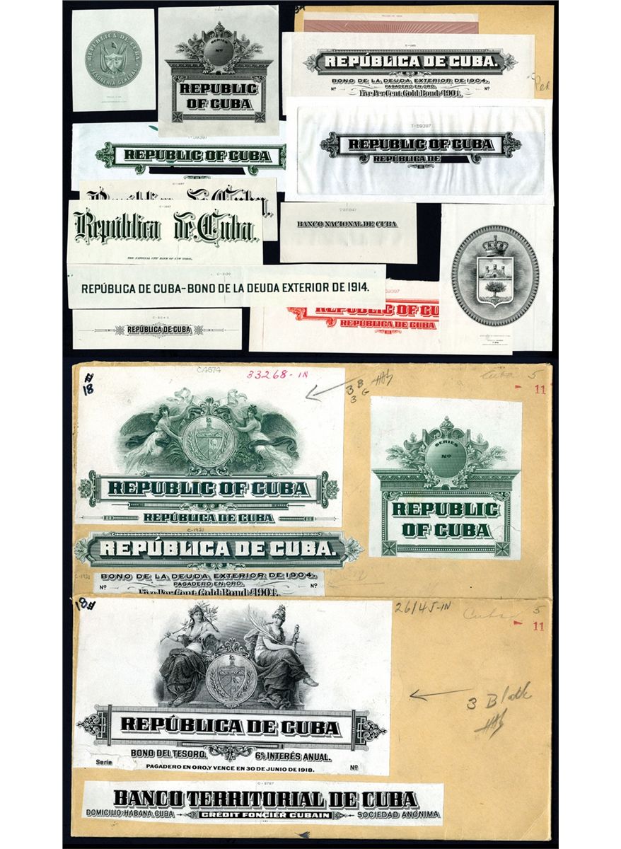 Cuba, Lot of 19 different proof vignettes. ND (ca.1900-1930's), All are printed on india paper mounted to manila file cards or envelopes or on india paper alone. Includes Arms of Cuba (4 with allegorical figures); Titles; Bond and stock tops with vignettes and titles; a Cuba Traveler's Check undertint; and miscellaneous other proofs. All are in VF to Choice uncirculated condition. ABNC proofs. Scarce group that cannot be duplicated.