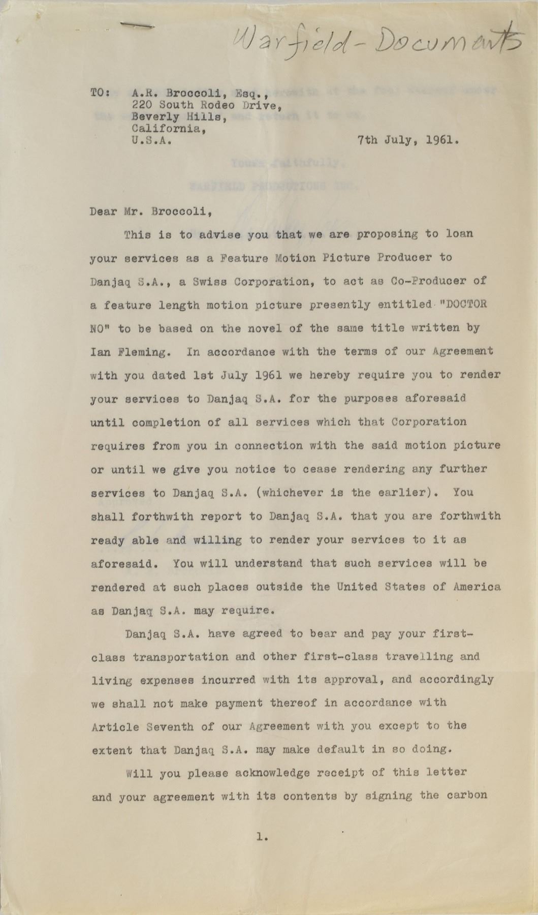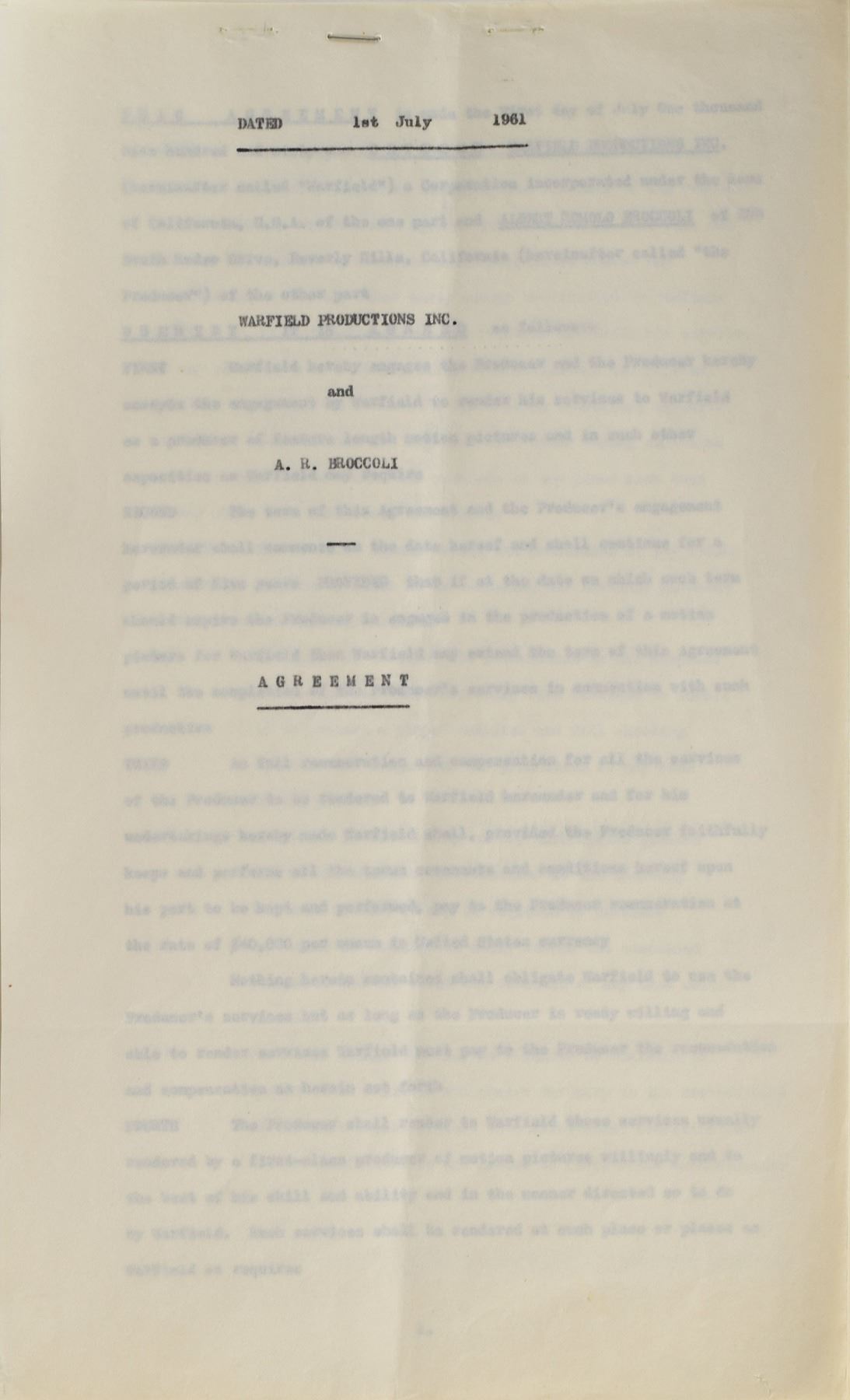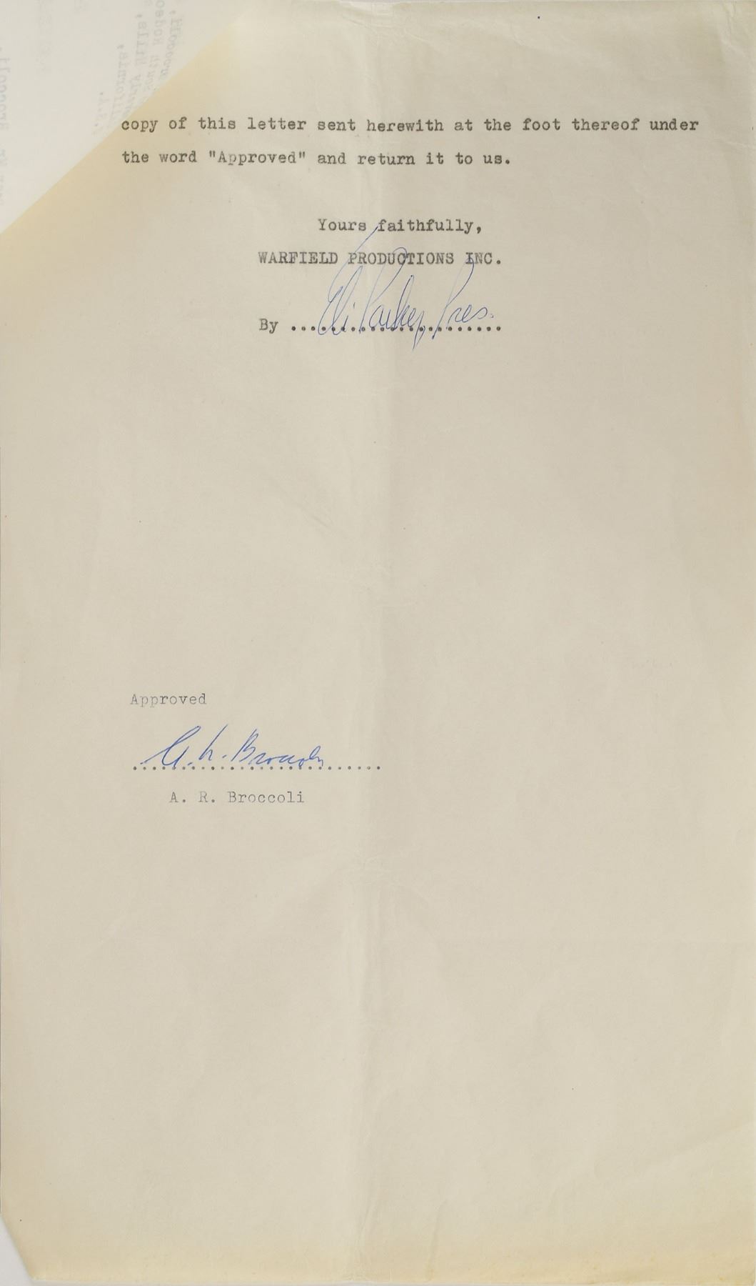 DS, signed “Albert Romolo Broccoli,” nine pages, 8 x 13, July 1, 1961. Contract between Warfield Productions, Inc., and Broccoli, in which the latter agrees "to render his services…as a producer of feature length motion pictures and in such other capacities…for a period of five years…at the rate of $40,000 per annum." Signed at the conclusion in blue ballpoint by Broccoli. Also included is an official agreement letter addressed to Broccoli by Warfield Productions, two pages, 8 x 13, July 7, 1961, in part: "This is to advise you that we are proposing to loan your services as Feature Motion Picture Producer to Danjaq S.A., a Swiss Corporation, to act as Co–Producer of a feature length motion picture presently entitled 'Doctor No' to be based on the novel of the same title written by Ian Fleming." Broccoli signs his approval at the conclusion in blue ballpoint, "A. R. Broccoli." In overall fine condition, with expected document wear. Alongside Canadian producer Harry Saltzman, Broccoli produced the first James Bond film, Dr. No, in 1962, through the parent production company Danjaq LLC, which was named after the first names of their respective wives—Dana and Jacqueline. In spite of mixed critical reviews, Dr. No proved a financial success, and marked the beginning of a partnership between Broccoli and Saltzman that would last until 1975. A magnificent early contract that represents Broccoli's entrance into the world of Agent 007.