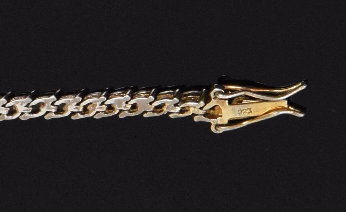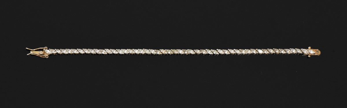 Cubic Zirconia Marquise Cut 925 Sterling Silver Tennis Bracelet, Signed By Designer DBJ. Estimated more than 50 yrs old. 925 Sterling Silver consisting of 92.5% silver and 7.5% copper. Tested Positive using Nitric Acid Chemical Scratch Test, Cloth Rub Test, Smell Test, and Magnet Test. Markings of 925 or Sterling stamp. The reason silver needs to be combined with other metals is that it is very difficult to make great designs with just pure silver, which is very soft and malleable. A bit of hardness has to be introduced by adding other metals such as copper. That is why jewelers are capable of making the most intricate an complex designs with 925 Sterling Silver. Silver is one of the most valuable elements next to gold. Mexico is the leading producer of sliver, followed by the United States, Canada, Australia, Spain, Peru, and Russia. Many countries do not require their precious metal items to be stamped and therefore we test to ensure we accurately represent the product. Size: See Ruler Photo. (Photos Represent The Condition Of The Lot.)